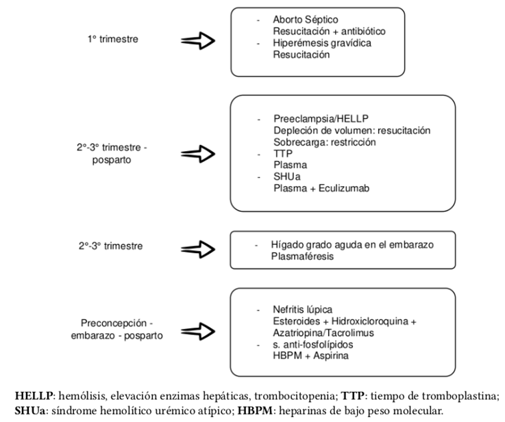 El tratamiento específico de la entidad nosológica causante de Emb-LRA es un pilar fundamental en el manejo de este tipo de pacientes. De este modo, hay que reconocer las etiologías probables según el trimestre de embarazo y, con base en esto, definir la conducta a seguir. En la Figura 5 se resume el manejo médico recomendado para la Emb-LRA en situaciones específicas según el tiempo de presentación17.