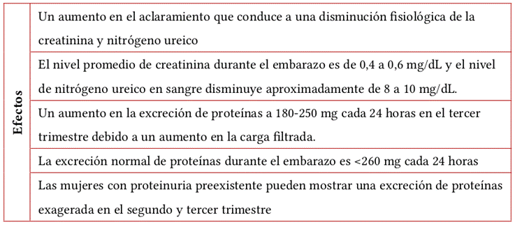 Otros cambios producidos durante el embarazo consisten en que el agua corporal total aumenta de 6 a 8 litros, de los cuales 4 a 6 son extracelulares y representan el edema durante el embarazo; esta expansión de volumen depende de la activación del sistema renina-aldosterona-angiotensina2. La excreción de proteínas en orina aumenta de 60-90 mg/día a 180-250 mg/día. Anatómicamente no se puede dejar atrás la importancia del epitelio tubular renal, ya que es muy sensible a hipoxia y factores procoagulantes que conducen a necrosis tubular y necrosis cortical renal. Las causas de daño tubular incluyen hipovolemia por hiperemesis gravídica/hemorragia posparto, abolición de la hiperfiltración en la PE debido a endoteliosis glomerular y oclusión de la vasculatura renal por detritos amnióticos2.