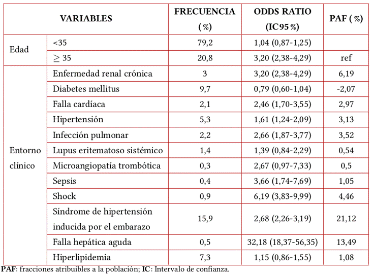 En un estudio de cohorte prospectivo realizado en pacientes obstétricas, Tyagi et al.18 observaron durante toda la estancia en la unidad de cuidados intensivos (UCI) la presencia o ausencia de varios factores de riesgo de LRA como trastornos hipertensivos del embarazo; hemorragia ante y post parto; HGA; hemólisis; síndrome de enzimas hepáticas elevadas; plaquetas bajas (HELLP); sepsis puerperal; coagulopatía intravascular diseminada; conmoción; trauma; cirugía anterior reciente; exposición a fármacos nefrotóxicos o agentes de radiocontraste; diabetes mellitus; comorbilidades preexistentes o anemia. Las comorbilidades incluían enfermedades crónicas del corazón, pulmón o hígado18. Vale la pena mencionar que Makusidi et al.19 demostraron que el 5% de todos los ingresos hospitalarios y el 30% de los pacientes ingresados a UCI se atribuyen a LRA.