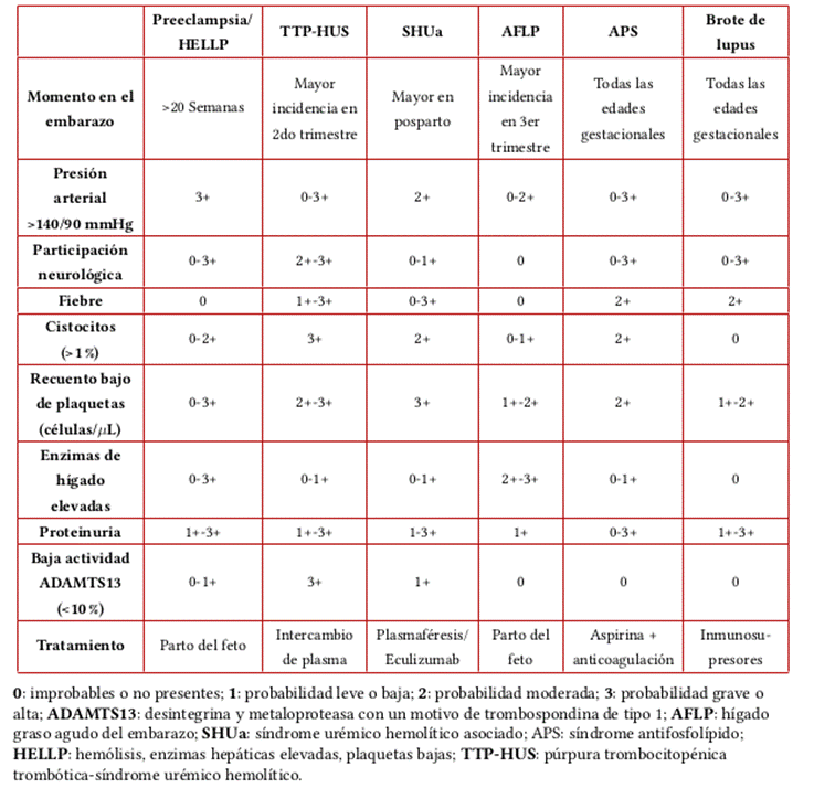 Las microangiopatías trombóticas renales comprenden trastornos como la purpura trombocitopénica trombótica (PTT) y el síndrome hemolítico urémico y sus características comunes son la oclusión diseminada de arteriolas y capilares con fibrina y posiblemente plaquetas aglutinadas que resultan en la destrucción mecánica de glóbulos rojos y disminución del recuento de plaquetas21. A pesar de que su ocurrencia durante el embarazo es rara, se asocian con una alta morbimortalidad materna y fetal. La deficiencia de ADAMTS-13, un von Willebrand proteasa que escinde el factor, es la responsable de la mayoría de los casos de PTT que ocurren, principalmente, en el segundo y tercer trimestre de los embarazos21.