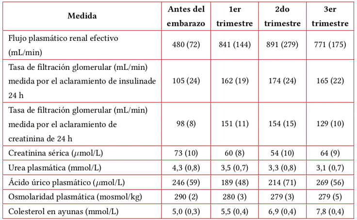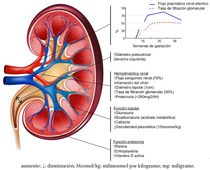 Durante la gestación ocurren diferentes cambios fisiológicos en la mayoría de los sistemas, siendo de gran impacto los cambios hemodinámicos a nivel renal. A saber, se presenta aumento del volumen sanguíneo, disminución de la resistencia vascular sistémica (incremento de los niveles sistémicos de vasodilatadores con resistencia relativa a vasoconstrictores) y aumento del gasto cardíaco; asimismo, en general se presenta una disminución de la presión arterial (PA) sistémica1,14,15(Figura 1 y Tabla 2). Efectos como la relajación del músculo liso debido a la progesterona combinado con la compresión mecánica por el útero en crecimiento pueden causar retención de orina en el sistema colector, con una consecuente hidronefrosis fisiológica durante el embarazo. Por otro lado, la TFG aumenta en un 50 %, lo que se traduce en una hiperfiltración que resulta en una disminución de la creatinina sérica cuyos valores normales son de 0.4-0.6 mg/dL durante el embarazo16. Debido a este estado de hiperfiltración durante la gestación, el valor de la excreción significativa de proteínas es el que supera los 300 mg en 24 horas (el doble del límite superior normal en un adulto sano)1.