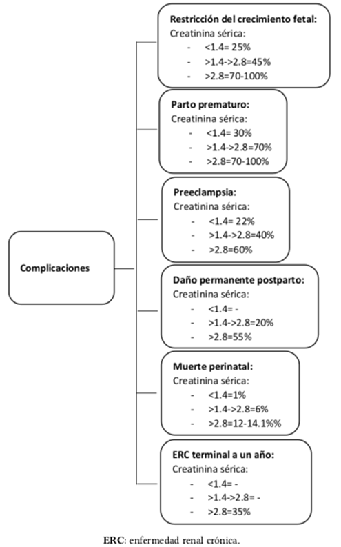 Cabe resaltar que las mujeres con ERC tienen menor capacidad de realizar las adaptaciones fisiológica a nivel renal necesarias para culminar un embarazo sin complicaciones asociadas a la disfunción de este órgano15. El aumento en la TFG durante la gestación es menor en mujeres con insuficiencia renal moderada y por lo general está ausente en aquellas con creatinina sérica >2,26 mg/dL (200 µmol/L)15. Por otro lado, se ha descrito que el embarazo puede influenciar la perdida de función renal en mujeres con ERC, pudiendo disminuir el tiempo de progresión y empeorando la clasificación hasta la etapa terminal1,11,16con un riesgo significativo de disminuir la TFG en gestantes con valores de creatinina sérica >1,4 mg/dL (124 μmol/L)14.