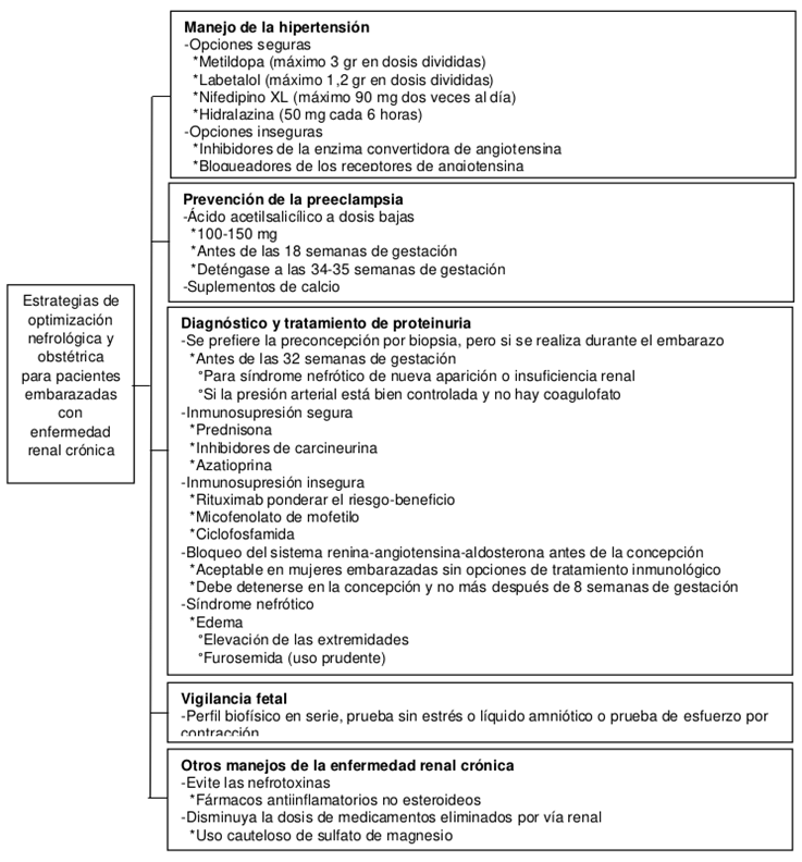 Algunas de las estrategias nefrológicas y obstétricas para la optimización en embarazadas con ERC se mencionan en la Figura 3.
