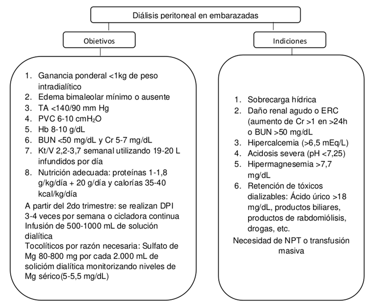 El tratamiento de la anemia en pacientes con terapia de remplazo renal normalmente requiere hierro intravenoso y una duplicación de la dosis de agentes estimulantes de la eritropoyetina para evitar la necesidad de transfusión36,50. De esta forma, se recomienda mantener un nivel objetivo de hemoglobina de 10-11 g/dL y una saturación de hierro >30 %36. De igual forma, se aconseja administrar el doble de la dosis diaria habitual de vitaminas solubles en agua, incluido un mínimo de 5 mg de ácido fólico en el primer trimestre, porque estos nutrientes son eliminados por diálisis. El magnesio es eliminado por los riñones, y, como tal, su toxicidad presenta un riesgo significativo en mujeres con ERC avanzada, especialmente aquellas en diálisis, por lo que su uso en infusión se recomienda en dosis más bajas (máximo 1 g/h)1. Otro punto a considerar es que debido a la perdida de aminoácidos por la diálisis (10-15 gr por día) se recomienda una ingesta de proteínas de 1,5-1,8 g/kg al día en embarazadas con ERT. En la Figura 4 se describen los objetivos e indicaciones de la diálisis peritoneal en embarazadas.
