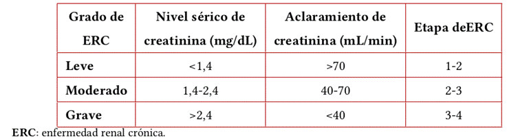 En la actualidad, la ERC durante el embarazo se puede definir como temprana cuando el nivel de aclaramiento de creatinina es >70 mL/min (estadio 1); moderada, entre 40 y 70 mL/min (estadios 2-3), y grave, <40 mL/min (estadios 4-5)2. Estos grados de disfunción y estadios se pueden correlacionar con niveles de creatinina sérica <1,4 mg/dL, 1,4-2,4 mg/dL y >2,4 mg/dL, respectivamente, tal como se observa en la Tabla 1.