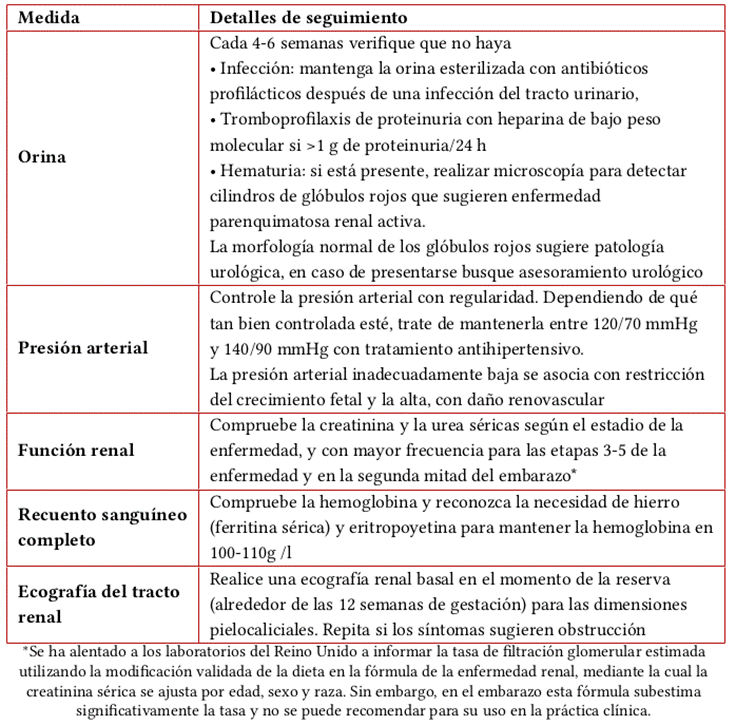 Las mujeres embarazadas con ERC deben ser monitoreadas conjuntamente por un nefrólogo y un especialista en medicina materno-fetal. Para este seguimiento se requiere monitorear y controlar la presión arterial, así como los niveles de calcio, fósforo, hormonas tiroideas, hemoglobina, glicemia, proteinuria y hematuria14,26; además, cuando sea apropiado se debe realizar una ecografía para detectar obstrucción urológica14 y así identificar cambios patológicos y poder establecer una intervención oportuna que optimice el resultado materno y perinatal.