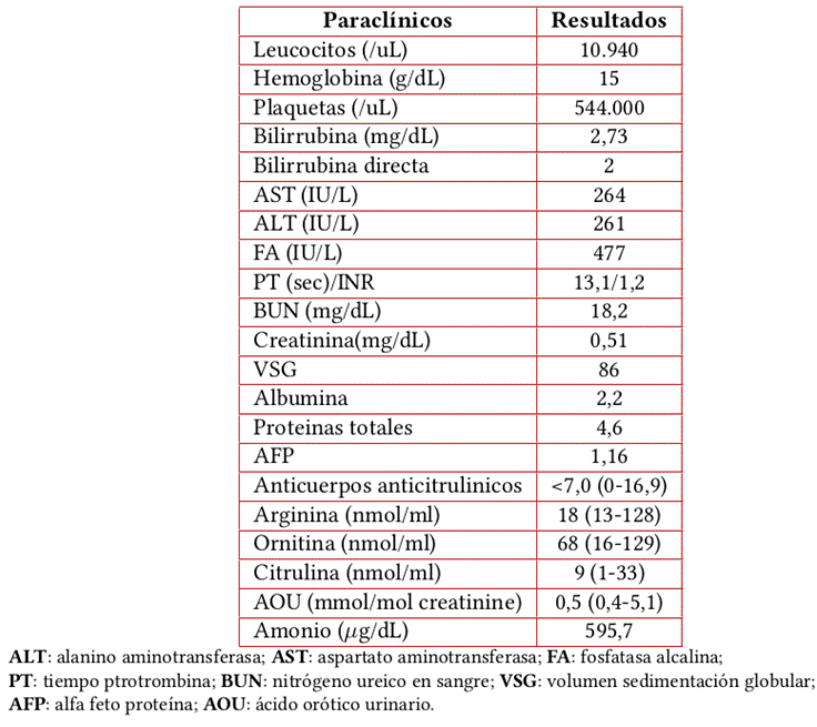 Paciente femenina de 35 años de edad con antecedente de masa abdominal en estudio y parto sin complicaciones 3 meses atrás, quien ingresó al servicio de urgencias por cuadro clínico consistente en alteración del estado de conciencia dado por episodio convulsivo. Al ingreso, la paciente se encontraba con estabilidad hemodinámica, estuporosa, afebril con ictericia y hepatomegalia. Dentro de los paraclínicos se evidenció hiperbilirrubinemia de predominio directo, elevación de transaminasas e hiperamonemia (Tabla 1). Sus familiares refirieron historia clínica negativa para infecciones y consumo de alcohol, medicamentos o tóxicos, pero mencionaron la presencia de una masa abdominal que apareció nueve meses antes. Debido al deterioro del estado de conciencia, se decidió asegurar vía aérea con intubación orotraqueal e iniciar manejo en unidad de cuidado intensivo (UCI) con equipo multidisciplinario y lactulosa, rifaximina, L- arginina y L- aspartato (LOLA).
