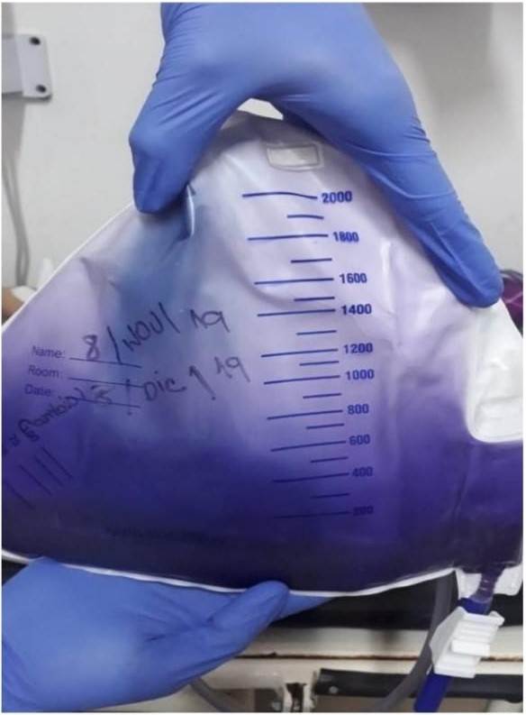 El paciente consultó nuevamente al centro de salud 17 días después por retiro accidental traumático de la sonda vesical y episodios eméticos múltiples en cuncho de café asociados a deposiciones melénicas, disautonomías, alzas térmicas no cuantificadas y malestar general. En esta ocasión ingresó bradicárdico con frecuencia cardiaca de 45 lpm, hipotenso con presión arterial media de 49 mmHg, afebril, sin signos de irritación peritoneal, con Glasgow 14/15 y reporte de paraclínicos previamente solicitados en los que se evidenció leucocitosis (L: 24.000) con neutrofilia (N: 22.000), anemia normocítica normocrómica (Hb:11,4 mg/dl), plaquetas en 303.000, función renal alterada con creatinina en 5,51 mg/dlL, nitrógeno ureico en 91 mg/dL con uroanálisis con un pH en 7,5, con esterasa leucocitaria positiva, sin nitritos y con bacteriuria, y urocultivo con Klebsiella spp patrón de betalactamasas de espectro extendido; sin embargo, llamó la atención la coloración púrpura de la orina en la bolsa recolectora y en la sonda vesical colocada en la visita anterior (Figura 1), por lo cual se ordenó trasladado a un centro de mayor complejidad para valoración prioritaria por sospecha de infección de vías urinarias complicada asociada a hemorragia de vías digestivas.