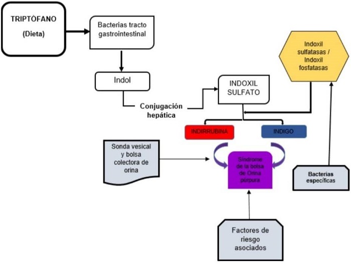 Dicho aminoácido es metabolizado y convertido en indol a nivel del intestino delgado, el cual, mediante la circulación portal, llega a nivel hepático en donde es conjugado convirtiéndose en indoxil sulfato, este último se excreta a través de la orina, en donde al interactuar con enzimas bacterianas con propiedades sulfatasas/fosfatasas se oxida y produce índigo e indirrubina, los cuales son de coloración azul y rojiza, respectivamente. De esta manera, al mezclarse las dos sustancias en un ambiente urinario alcalino (el cual es propiciado por bacterias específicas) en una bolsa reservorio de plástico, la orina se torna del color púrpura característico de esta patología12 (Figura 2).