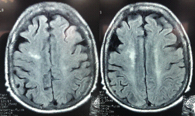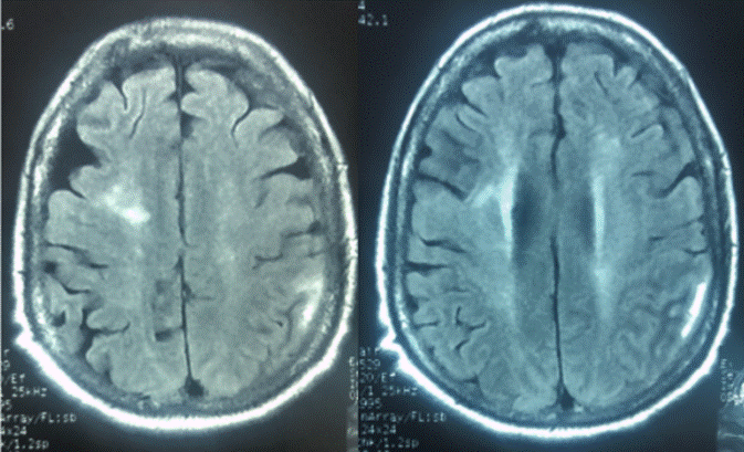 Durante la hospitalización se decidió también suministrarle a la paciente doxasosina a dosis de 4 mg/día, con lo cual, de forma paulatina, recobró el nivel de consciencia sin reaparición de crisis epilépticas y con cifras tensionales de 150/80. De esta forma, fue dada de alta y se ordenó seguimiento por consulta externa a los 30 días con resonancia de control (Figura 2), donde se observó desaparición de las lesiones corticales (posibles causas de las crisis epilépticas) y disminución de estas en sustancia blanca subcortical, las cuales pudieron estar relacionadas con leucoaraiosis periventricular. Para ese entonces la paciente se encontraba asintomática.