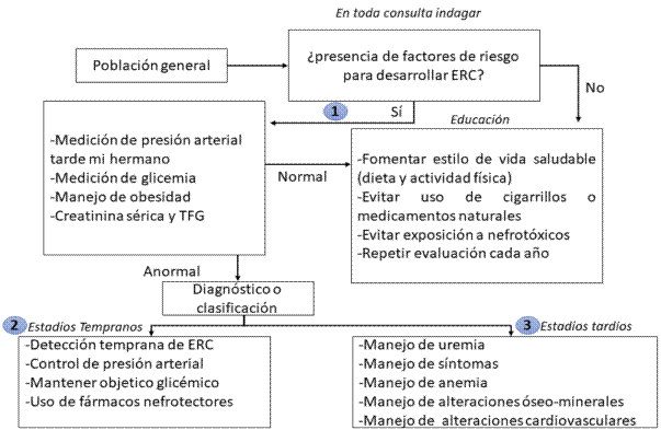 Ya habiendo esclarecido quiénes son los pacientes con factores de riesgo o que ya cuentan con un deterioro de su función renal, se debe comenzar a aplicar la prevención secundaria iniciando con lo más básico y accesible: buen control de comorbilidades, optimización de la presión arterial y manejo de glicemia dentro de los rangos. Dada la naturaleza asintomática de la ERC, el cribado juega un rol importante en la detección temprana, ya que permite reconocer los individuos en quienes ya se inició el daño renal pero no han presentado signos o síntomas; por tanto, sería ideal realizarlo en toda la población, pero por temas de costo-efectividad la búsqueda de casos se realiza teniendo en cuenta factores de riesgo como edad 14 mayor a 65 años, diabetes mellitus, HTA, historia familiar de ERC o exposición de drogas nefrotóxicas.
