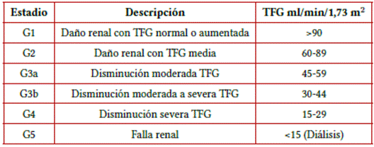 Para el año 2002, la National Kidney Foundation (NKF) publicó las guías K/DOQI (Kidney Disease Outcome Quality Initiative), en donde se estableció tanto la definición universal de la ERC como su evaluación y clasificación, siendo esto una apertura al reconocimiento de la importancia de esta patología durante la última década. De esta forma, la ERC se definió como un daño renal o una tasa de filtrado glomerular (TFG) <60 mL/min/1,73 m2 presente durante al menos tres meses, considerando el daño renal como la presencia de anormalidades estructurales o funcionales del riñón que puedan provocar potencialmente un descenso de la TFG. Más adelante, en el año 2012, en las guías KDIGO (Kidney Disease: Improving Global Outcomes) se incorporó a la definición y clasificación la evaluación de las causas de la ERC y de la albuminuria, respectivamente, ya que estos factores pueden impactar en el pronóstico y la elección del tratamiento17-19. En la actualidad, la clasificación se realiza según la TFG (Tabla1).