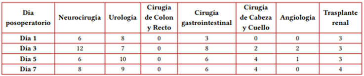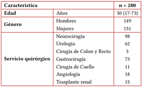 Durante los 18 meses de este estudio, 280 pacientes consecutivos fueron sometidos a cirugía mayor. El grupo de estudio estuvo integrado por 149 hombres y 131 mujeres, con una mediana de edad de 50 años (rango de 17 a 71 años). Las cirugías fueron realizadas en cinco servicios especializados independientes: Neurocirugía, Urología, Cirugía Gastrointestinal, Angiología y Cirugía de Cabeza y Cuello. Los procedimientos más frecuentes por servicio fueron resección de tumores cerebrales y laminectomías para neurocirugía (51 %), resección transureteral de próstata (RTUP) y nefrectomías para cirugía urológica (47 %), colecistectomías, drenaje de abscesos intraabdominales y gastrectomías para cirugía gastrointestinal (48 %), tiroidectomía parcial o completa para cirugía de cabeza y cuello (50 %) y exploración vascular con endarterectomía para el servicio de angiología (50 %) (tablas 1 y 2).