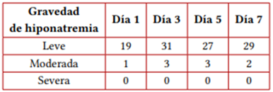 Durante el primer día posoperatorio, 20 pacientes (7,1 %) desarrollaron hiponatremia. Tres días después de la cirugía, 34 (12,1 %) la desarrollaron, al quinto día posoperatorio fueron 30 sujetos (10,7 %) y al séptimo día fueron 31 (11 %) pacientes que la presentaron (figura 1). En la mayoría de los casos se trató de hiponatremia leve (tabla 3). La frecuencia de hipokalemia al primer, tercer y séptimo día posquirúrgico fue de 25 %, 25 % y 32 %, sin embargo, el número de pacientes en quienes fue posible realizar la determinación de dicho electrolito sérico fue menor que el analizado para el sodio.