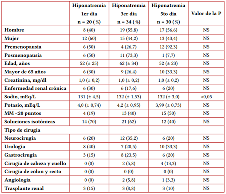 Resultados: 280 pacientes fueron estudiados, de los cuales 20 (7,1 %) desarrollaron hiponatremia durante el primer día posoperatorio, 34 (12,1 %) en el tercero, 30 (10,7 %) en el quinto día y 31 (11 %) en el séptimo día. En el primer día posoperatorio, los pacientes sometidos a cirugías urológicas y gastrointestinales desarrollaron hiponatremia con mayor frecuencia. Ninguno de los pacientes desarrolló complicaciones graves y no hubo relación entre la edad, el género o el tipo de soluciones y el desarrollo de hiponatremia.