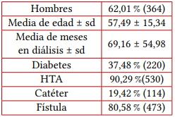 También se recolectaron datos de variables clínicas (edad, sexo, talla, peso, índice de masa corporal, régimen de salud, tiempo en hemodiálisis, acceso vascular, estado de hidratación y comorbilidades como diabetes, hipertensión, cardiopatía isquémica, enfermedad pulmonar obstructiva crónica, enfermedades autoinmunes, entre otras), variables de laboratorio (hemoglobina, albúmina sérica, fósforo, calcio, hormona paratiroidea intacta, recuento de linfocitos y dosis de diálisis) y variables clínicas durante el periodo de seguimiento (fiebre, tos, disnea, secreción nasal, cefalea, diarrea, astenia, adinamia y mialgias).