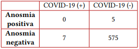 Results: 587 patients were included. Anosmia prevalence was 0.85% (5 patients) and the incidence of COVID-19 was 1.19% (7 patients). There was no statistically difference in demographic, clinical, and laboratory comparison between patients with and without anosmia. The presence of anosmia had a sensitivity and a positive predictive value of 0%, but a specificity of 99.14% and a negative predictive value of 98.8%. The accuracy was 97.9%.