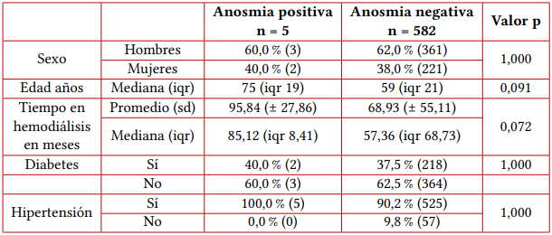 Los pacientes con anosmia tenían más tiempo en diálisis (95,84 meses versus 68,93 meses) y tenían mayor edad (75 años versus 59 años), sin diferencia estadística (tabla 3).
