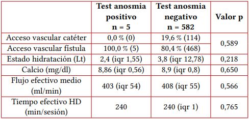 Al comparar los pacientes con y sin anosmia, no hubo diferencia en la distribución de pacientes según sexo, presencia de diabetes o hipertensión, tipo de acceso vascular, estado de hidratación, flujo efectivo y dosis de diálisis (Kt/V) (tablas 3 y 4).