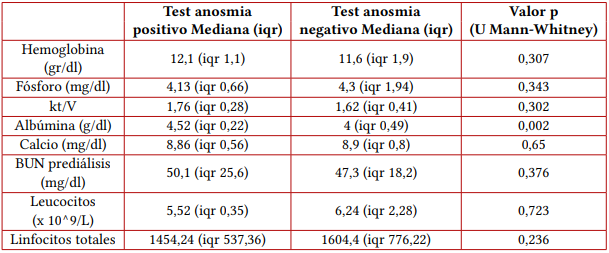 Tampoco se encontraron diferencias estadísticamente significativas en los parámetros de laboratorios clínicos de hemoglobina, fósforo, calcio sérico, nitrógeno ureico prediálisis, recuento de leucocitos y recuento de linfocitos (tabla 5). Solo se encontró diferencia estadísticamente significativa en los valores de albúmina sérica, siendo esta mayor en el grupo con anosmia (4,52 g/dl versus 4,0 g/dl), pero ambos dentro de los valores adecuados para la meta de cumplimiento establecida.