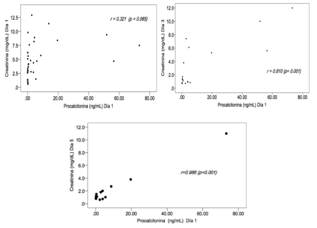 El nivel de CrS al día 1 mostró una débil correlación positiva; r = 0,321 (p = 0,065), mientras que la correlación fue positiva al día 3 con r = 0,810 (p = 0,001) y al día 5 con r = 0,986 (p = 0,001) (figura 1).