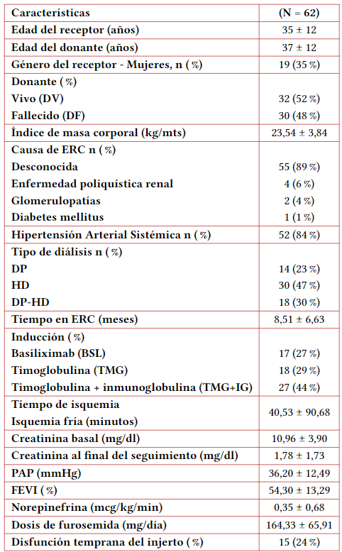 El 65 % de los pacientes correspondió a género masculino con edad promedio de 35 años; en su mayoría con hemodiálisis al momento del TR y con similar proporción en el tipo de donación. La inmunosupresión de inducción fue principalmente a base de TMG y el 24 % de los receptores de trasplante presentaron DTI (tabla 1).