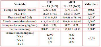 Al momento de la comparación por grupos, la fracción de eyección del ventrículo izquierdo (LVEF), la uresis residual, la uresis durante el transquirúrgico, la dosis de noradrenalina y la furosemida se asociaron con DTI (p < 0,05) (tabla 2).