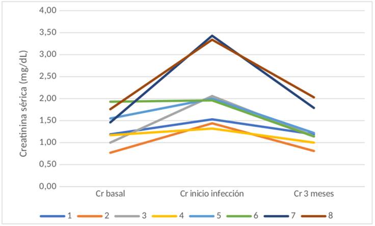 El curso clínico fue favorable en todos los pacientes, con una estabilización de la creatinina a los tres meses de presentada la infección. La creatinina basal promedio fue de 1,35 ± 0,39 mg/dL, al momento del diagnóstico de la infección por ADV fue de 2,14 ± 0,81 mg/dL. Cuando los síntomas se resolvieron, la creatinina promedio fue de 1,29 ± 0,40 mg/dL (figura 1). El tiempo de resolución de la sintomatología clínica fue de 24 días (intervalo de 7 a 90 días).