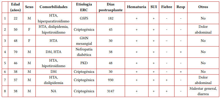 Results: Of 256 transplant patients, eight patients had a diagnosis of hemorrhagic cystitis or interstitial nephritis secondary to ADV infection. It presented early (≤ 3 months) in 62%, who presented with macrohematuria, associated with sterile pyuria and lymphopenia. Alterations in renal function were presented in 87.5%. The reduction of immunosuppression was the fundamental pillar in the management.