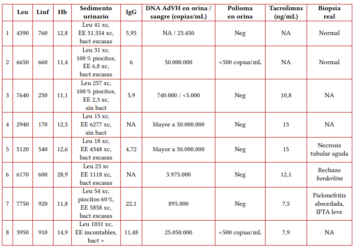 La ecografía del injerto renal fue normal en la mayoría de los pacientes, con excepción de uno en quien se evidenciaron signos radiológicos de pielonefritis del injerto. El diagnóstico de cistitis hemorrágica se realizó mediante los hallazgos clínicos, sumado ello al aislamiento de adenovirus en orina con una carga viral significativamente alta. En dos casos se realizó el diagnóstico con viremia por adenovirus y en dos pacientes se aisló poliomavirus concomitantemente con una carga viral débil (menor de 500 copias/mililitro). La biopsia renal se realizó en cinco pacientes, de las cuales dos resultaron completamente normales, en un paciente se documentó necrosis tubular aguda del 20 %, en otro rechazo borderline y en el paciente con mayor compromiso del injerto, se presentó pielonefritis aguda abscedada, con fibrosis intersticial y atrofia tubular leve.