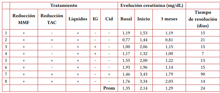 El tratamiento establecido en todos los pacientes fue disminuir la dosis de la inmunosupresión. La reducción de micofenolato fue en promedio 1 gramo y en cuatro de ellos también se redujo la dosis de tacrolimus. Se indicó la administración de cidofovir al único paciente que presentó compromiso del injerto con pielonefritis aguda abscedada, el cual se administró tardíamente dada la necesidad de importación del medicamento al país. En dos pacientes que presentaron niveles bajos de IgG, se optó por administración de gammaglobulina en conjunto con la reducción de inmunosupresión (tabla 3).