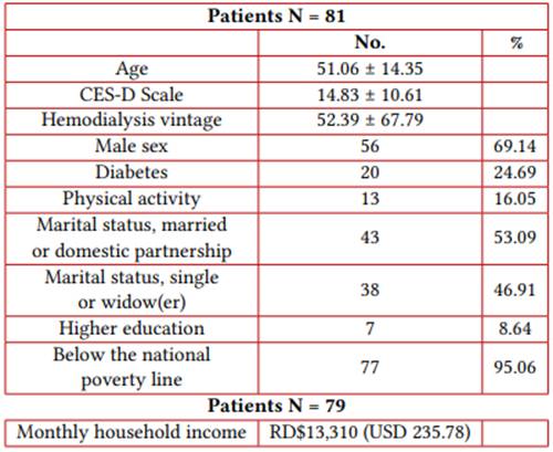 Methods: We conducted an observational, cross-sectional study with 81 patients. Data was collected using a survey that included sociodemographic variables, the Center for Epidemiological Studies Depression Screening Index (CES-D), and the Kidney Disease Quality of Life (KDQOL-SF36). Data were analyzed using the software Epi Info™ 7.2, t-test, ANOVA, and correlation coefficient.