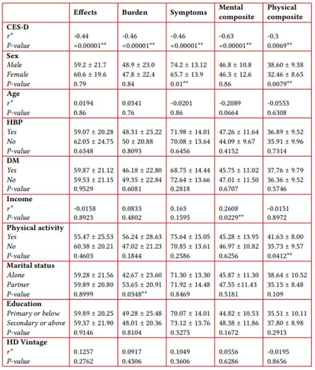 Resultados: la gravedad de los síntomas fue mayor en el sexo femenino que en el masculino (65,7117 vs. 74,2874). Los componentes de KDQOL-SF36 mostraron una correlación negativa con la puntuación de la escala CES-D. El ingreso del hogar tuvo una correlación positiva leve (r = 0,2608, p = 0,0229). La actividad física mostró estar asociada con la escala (41,6346 vs. 35,7365, p = 0,0412). Los pacientes con parejas tuvieron mejor calidad de vida que los pacientes solteros (53.6585 vs 42.6783, p = 0.0348).
