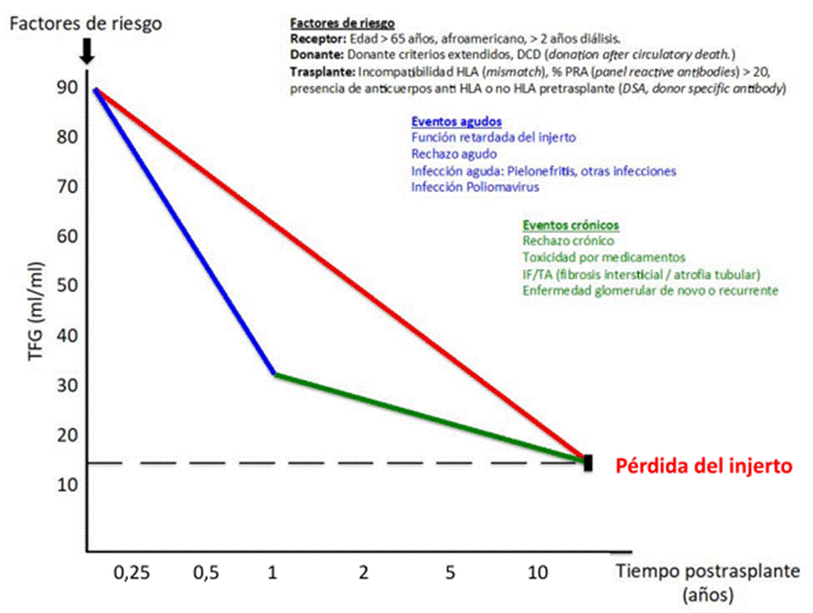 De acuerdo con el consenso español de disfunción renal en el paciente con trasplante renal, la disfunción crónica del injerto es: “la culminación de un deterioro progresivo de origen multifactorial, caracterizado por un descenso de la tasa de filtración glomerular (TFG) y la presencia de IF/TA, pero pueden verse otros tipos de lesiones, ninguna específica. Es un diagnóstico de exclusión” (6). En la figura 1 se encuentran los principales factores relacionados con la pérdida del injerto, describiendo algunos de riesgo pretrasplante y eventos agudos (aparición temprana con deterioro rápido de la TFG) y crónicos (aparición tardía con deterioro lento de la TFG). La intervención de estos factores de riesgo permitiría aumentar la sobrevida del injerto.