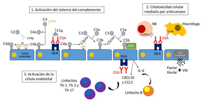 Las funciones efectoras de los DSA para la generación de inflamación vascular y la consecuente lesión tisular crónica pueden dividirse en las relacionadas con el complemento y no relacionadas con el complemento (figura 2):