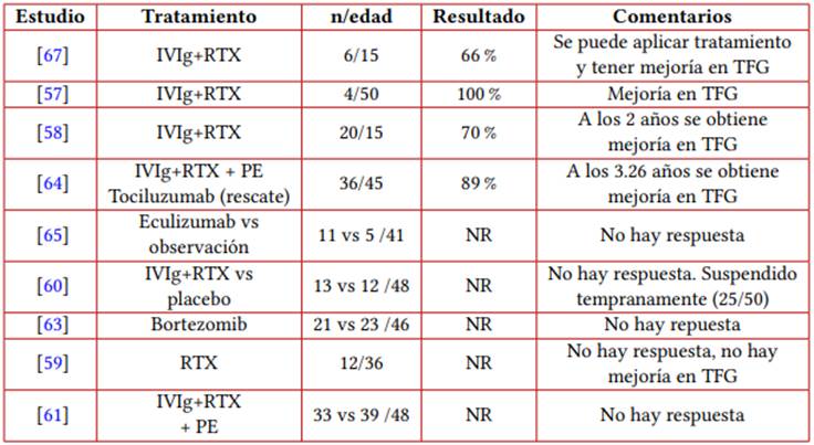 El uso de bortezomib no previene la progresión de la disfunción del injerto ni reduce las características de la actividad de la enfermedad en el cABMR (63). La utilización de tocilizumab (64) y eculizumab (65) en pacientes con cABMR generan estabilización en TFG, sin embargo, aún no hay ensayos clínicos que demuestren su efectividad. La utilización de daratumumab (66) puede ser efectivo, pero aún no hay ensayos clínicos que demuestren su efectividad.
