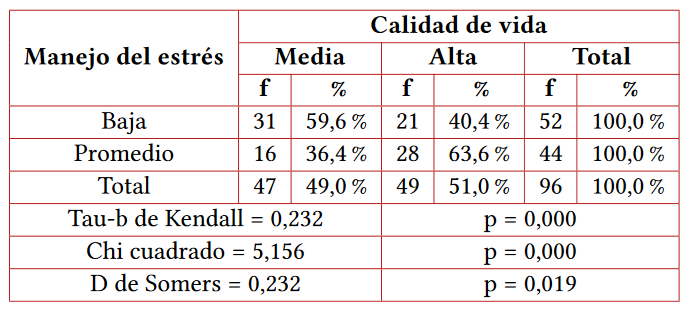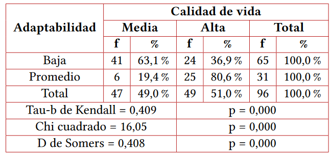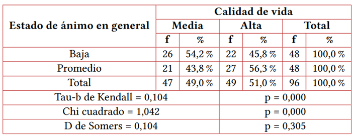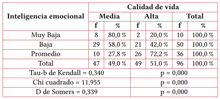 Results: The relationship for emotional intelligence and quality of life shows a value of p < 0.05, using the Chi-square test, the Kendall Tau-b statistic = 0.340, explains the positive direction of the relationship and moderate intensity of the association. , Somers' D statistic=0.339 confirms that emotional intelligence in general improves the quality of life of patients at a medium intensity. A significant relationship was also found for each of the dimensions of emotional intelligence with quality of life.