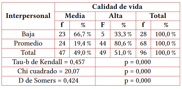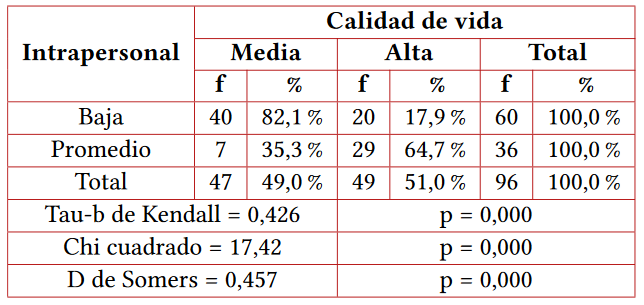Los resultados permiten paralelamente afirmar las hipótesis específicas de relación entre la calidad de vida y los componentes de la inteligencia emocional, que son los siguientes: intrapersonal, interpersonal, adaptabilidad, manejo de estrés y estado de ánimo en general. Sin embargo, dicha asociación varía en intensidad de acuerdo a las medidas estadísticas tau-b de Kendall y d de Somers, siendo las más fuertes aquellas halladas para los componentes intrapersonal e interpersonal, permitiendo que dicho procedimiento dé una mayor consistencia a la investigación, como se puede evidenciar en las tablas 2 a la 6.
