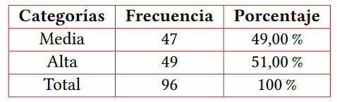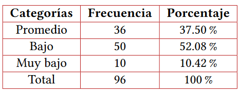 Finalmente, se muestran, en las tablas 7 y 8, los resultados descriptivos para las variables inteligencia emocional y calidad de vida, respectivamente. En estas podemos observar que los niveles de inteligencia emocional se presentan en tres categorías: promedio, bajo y muy bajo; en la categoría bajo se agrupa el mayor número de pacientes; mientras la calidad de vida se encuentra en las categorías media y alta, encontrándose en la categoría alta una mayor cantidad de evaluados.