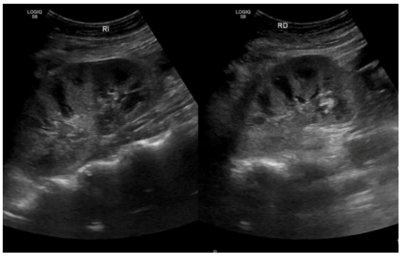 En los exámenes de laboratorio de ingreso (tabla 1), se encontró azoemia (creatinina 2.8mg/dl, urea 121mg/dl), hipoalbuminemia severa (albúmina 1,2 gr/dl), hiponatremia moderada, dislipidemia mixta, orina completa: 24-28 leucocitos por campo, 3.5 hematíes por campo, glucosa 2+, proteínas 3+, proteinuria corregida 9.3 gr/24 horas. Los exámenes para descartar causas secundarias de compromiso glomerular fueron negativos (tabla 2). Radiografía de tórax: derrame pleural izquierdo y atelectasia laminar. Ecografía renal (figura 1): riñones de tamaño normal con buena diferenciación de la corteza.