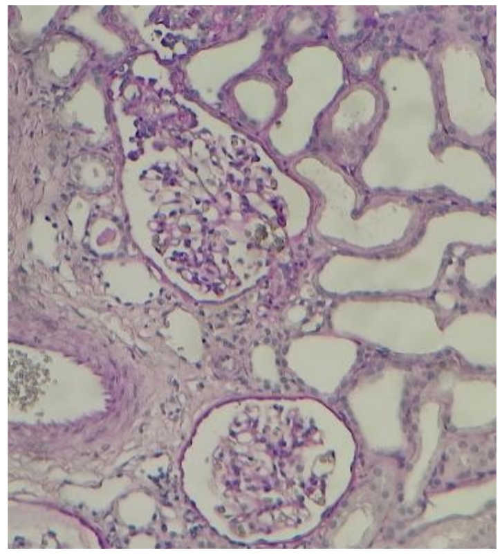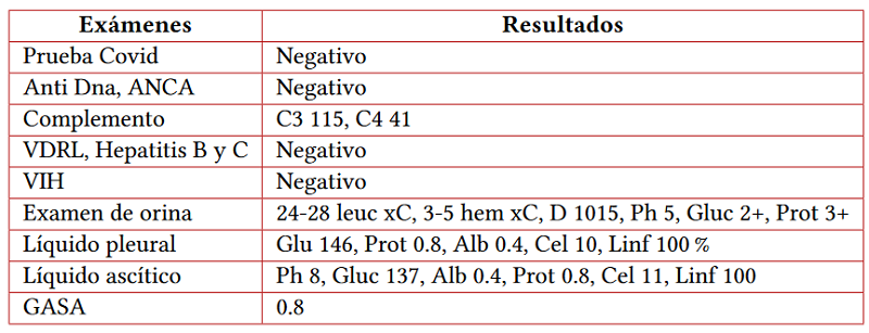 El paciente cursa con empeoramiento de la función renal y ausencia de respuesta al manejo diurético, por lo que ingresa a hemodiálisis de soporte. Se realizó toracocentesis evacuatoria de 900 ml, con líquido transparente característico de trasudado; también paracentesis diagnóstica y evacuatoria de 2000 ml, de líquido claro con característica de trasudado y GASA 0.8, que indica como causa probable de la ascitis al SN. Se realizó biopsia renal (figura 2): podocitopatía, glomerulopatía colapsante. Se inicia tratamiento con corticoterapia, evidenciándose mejoría de la función renal, por lo que se suspende hemodiálisis. Paciente es dado de alta para seguimiento ambulatorio, pero con persistencia de ascitis.