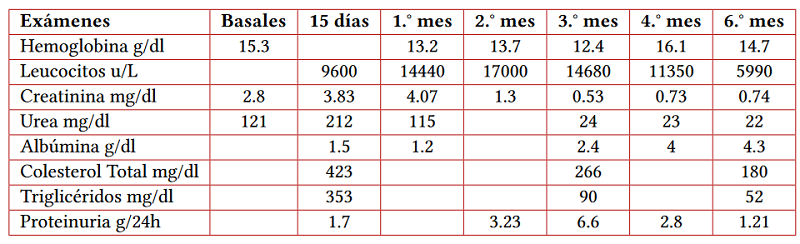 Después de 4 semanas de iniciada la corticoterapia, mantiene hipoalbuminemia, efusión pleural, ascitis, y se agrega intolerancia oral. Se realiza paracentesis evacuatoria, que fue necesario repetir en varias ocasiones. Se decide colocación de catéter peritoneal tunelizado (técnica de minilaparotomía realizada por médicos nefrólogos) para el manejo de la ascitis refractaria, realizándose drenaje de líquido ascítico interdiario mediante dicho catéter. La ascitis fue disminuyendo progresivamente hasta retirarse el catéter peritoneal a las 4 semanas de haber sido colocado. Por persistencia de hipoalbuminemia y proteinuria en rango nefrótico, se decide iniciar ciclofosfamida en bolos mensuales (1gr/m2sc).