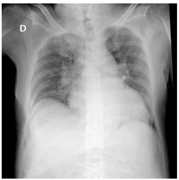 Además, el paciente fue valorado por el servicio de Cardiología que inició manejo para falla cardiaca e indicó descartar el sustrato isquémico por reducción de la FEVI, según reporte previo de ECO TT de hace tres meses con FEVI preservada del 50 %. Se pasó a arteriografía coronaria con reporte de stents permeables sin rastro de enfermedad coronaria aguda, pero el paciente continuaba congestivo y ante la presencia de derrame pleural bilateral, se pidió una ecografía de bases pulmonares con hallazgo de derrame bilateral (derecho: 377 cc, izquierdo: 268 cc) con predominio derecho, previo a hemodiálisis.