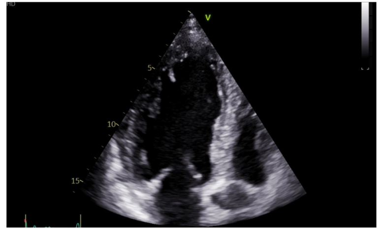 Ingresa a hospitalización y se toman los paraclínicos, los cuales reportan: péptido natriurético tipo B (NT PROBNP): muy elevado de 66.526, electrocardiograma (ECG) con ritmo sinusal, eje desviado a la izquierda y sin trastorno de la repolarización del segmento ST; radiografía de tórax con opacidades en vidrio deslustrado, sin consolidaciones, cardiomegalia y derrame pleural bilateral (figura 1); ecocardiograma transtorácico (ECO TT), donde se evidencia una cardiopatía isquémica con hipertrofia excéntrica del ventrículo izquierdo (VI) con alteraciones de la contractilidad y disfunción sistólica severa, una fracción de eyección del ventrículo izquierdo (FEVI) del 30 %, STRAIN global longitudinal de -7,3 %, disfunción diastólica moderada y una severa dilatación de la aurícula izquierda (AI); además de hipertensión pulmonar de PSAP de 49 mmHg (probabilidad intermedia), ventrículo derecho de tamaño y función normal (figura 2).