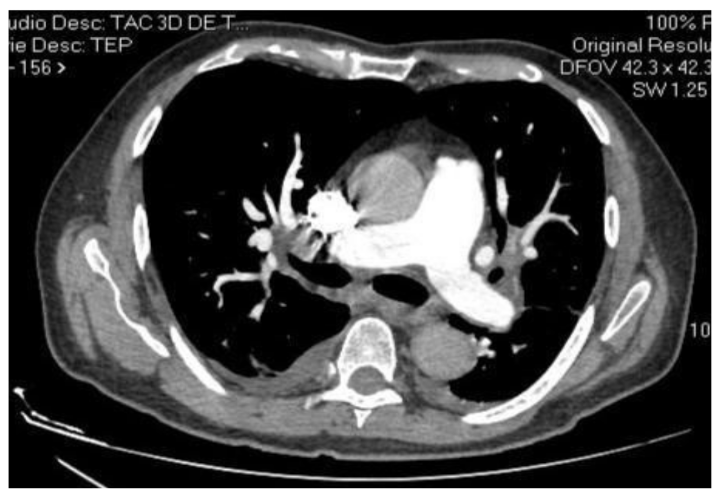El paciente es valorado por el servicio de Nefrología, el cual ordena hemodiálisis diaria, con sesiones de 4 horas cada una, sin heparina y volumen de 350 ml/min - ultrafiltrado de 3000 cc. Posteriormente, el paciente presentó exacerbación de la disnea y se solicita dímero D con reporte de 700, ante lo cual se complementa con una angiotomografía de vasos pulmonares (angiotac), de acuerdo con el protocolo para tromboembolismo pulmonar (TEP) con reporte negativo para TEP (figura 3). Adicionalmente, se realizaron laboratorios de control creatinina en suero: 9,23 mg/dl, potasio: 5,33 meq/l, sodio: 138 meq/l, hematocrito: 36,7 %, hemoglobina: 11,2 gr/dl, leucocitos: 11.590, neutrófilos: 80,9 %, plaquetas: 275.000 y HBA1C fuera de metas (9,5 %), lo que aumenta su riesgo cardiovascular.