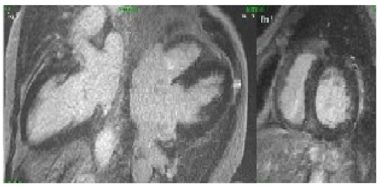 Al seguimiento de Cardiología, en vista de no tener enfermedad coronaria aguda, se indicó descartar miocardiopatía infiltrativa a través de una resonancia magnética (RMN) cardiaca con contraste (figura 4), la cual fue negativa, por lo que se requirió hemodiálisis antes y después del procedimiento, de acuerdo con las pautas por Nefrología. En este momento el paciente estaba estable y no congestivo, por lo cual con el esquema de hemodiálisis ya prescrito y el manejo para falla cardiaca ya establecido, se indicó el alta médica con diagnóstico de SCR tipo 4.