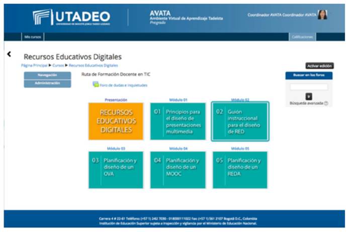 Este recurso se dispuso en el Ambiente Virtual de Aprendizaje Tadeísta (AVATA) dentro de la categoría de capacitación docente; categoría que consigna varios cursos que corresponden a la ruta de formación docente en TIC, como capacitación en Moodle y la capacitación en herramientas digitales. Cabe resaltar que algunos de los cursos fueron planificados y diseñados por la autora de este artículo, tanto en contenidos, como en el diseño de los MED y del ambiente de aprendizaje. Cada uno de los cursos se compone de varios módulos, y el de RED está compuesto por cinco módulos (ver figura 1).