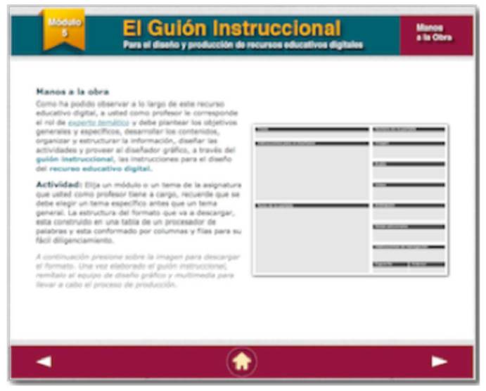 El módulo 5, manos a la obra, corresponde a la actividad de elaborar el guion instruccional. Al presionar sobre la imagen se puede descargar el formato, diseñado exclusivamente para este recurso (ver figura 10).