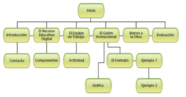 El RED está construido en una estructura hipertextual ramificada en la que se incluyen nodos subordinados para una mayor interactividad. Posee un nodo principal o de inicio (primer nivel) que da paso a seis nodos principales (segundo nivel) que corresponden a los seis módulos que lo componen; de cada uno de estos nodos principales (segundo nivel) se desprenden nodos de tercer y cuarto nivel (ver figura 3).