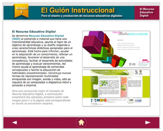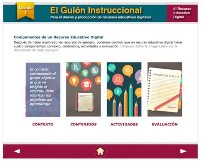 Para apoyar la definición, se incluyen en la pantalla dos imágenes relacionadas temáticamente con el tema del guion instruccional, que representan ejemplos de recursos educativos digitales; el primero corresponde a la presentación de un curso sobre diseño instruccional para profesores de la Universidad Nacional Autónoma de México (UNAM); este recurso está disponible solo para profesores adscritos a la UNAM. El segundo corresponde a un RED sobre la gestión de objetos virtuales de aprendizaje que pertenece al Ministerio de Educación Nacional de Colombia y el portal Colombia Aprende, este recurso es abierto y se puede explorar en su totalidad. En la página 2, del módulo 2, se describen y definen los componentes de un recurso educativo digital (ver figura 6).